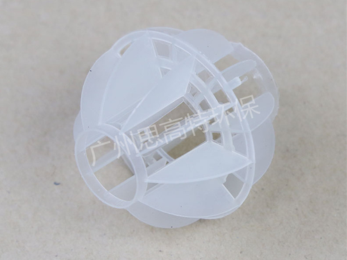 多面空心球采用聚丙烯(PVC)塑料制成球状,由两个半球合成一个球形,每个半球上开有12个半扇形叶片,两个半球的扇形叶片相互错开。该填料特点是比表面积大,空隙率较高。但是由于叶片数偏多,彼此间有遮蔽效应,不利于液体分布和润湿;液体大多在球体空心柱聚集,阻碍气体畅通,因此阻力较大。此种填料多用于水处理工程。